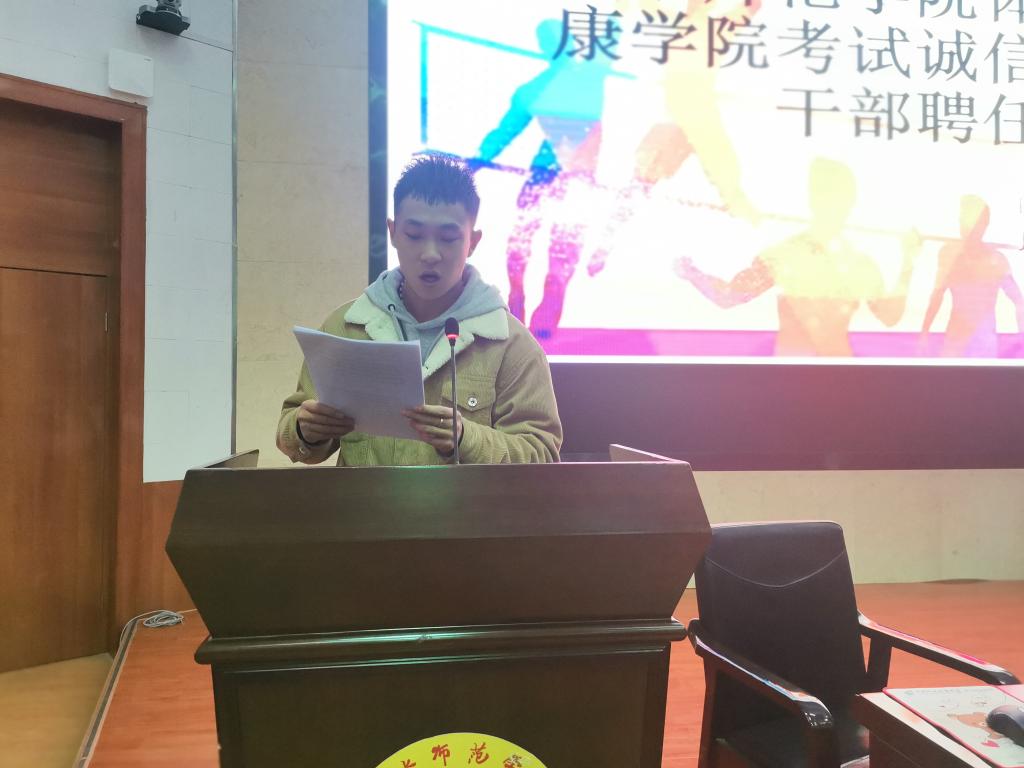 员工代表18级社体一班李佳明同学作考试诚信承诺发言,并倡导全体员工以诚信为本,立德修身,自觉严肃考风考纪,营造诚信、文明、积极、向上的考试氛围。