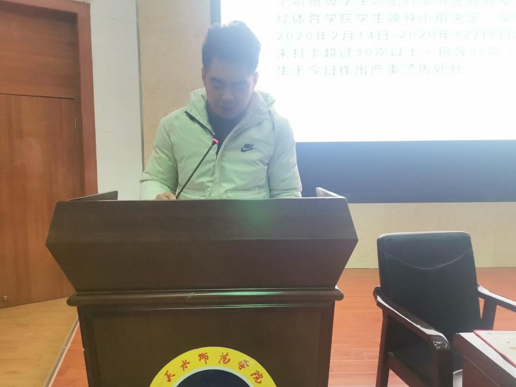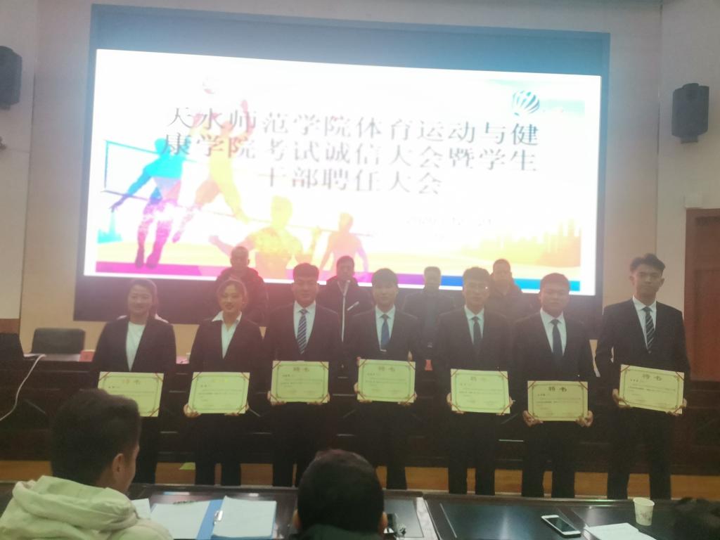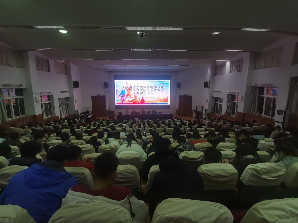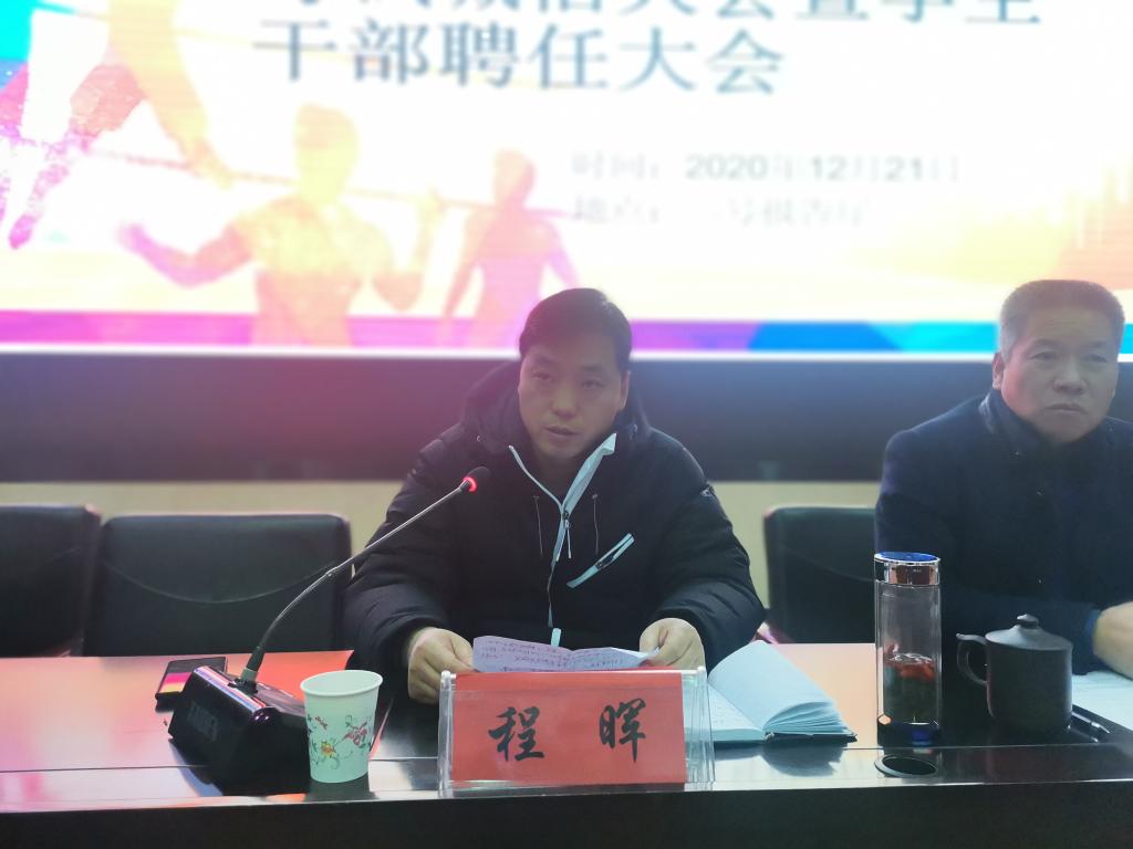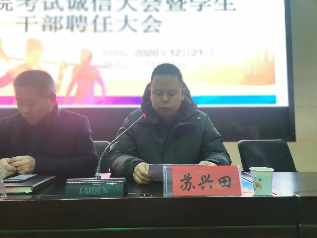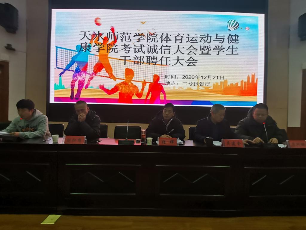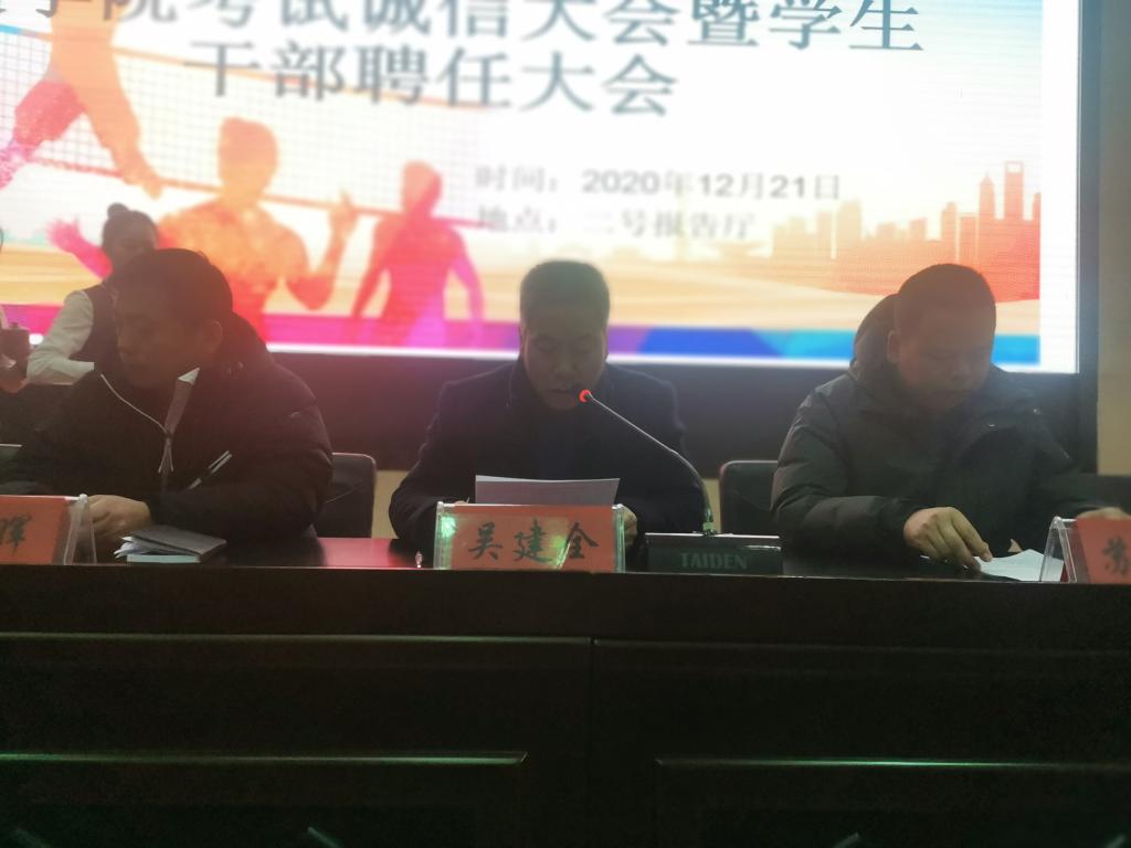 12月21日晚,体育公司在二号报告厅召开考试诚信教育大会暨员工干部聘任大会,公司党政领导班子,各教学系(部)主任,辅导员,19级、20级各班班主任,20级全体员工,以及19级、18级、17级各班员工代表共计370多人参加。大会由公司团委书记王昊支持。