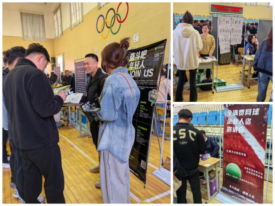 本次招聘会上,体育类招聘单位有中小公司、校外培训机构等。同时,太阳成集团tyc234cc特邀了天津艾克仕体育、北京优享健身、西安全满贯网球3家体育企业,提供岗位既有传统的体育教师、健身教练,也有新兴的体育赛事策划、体育媒体运营等职位,为员工们提供了更多的选择空间。
