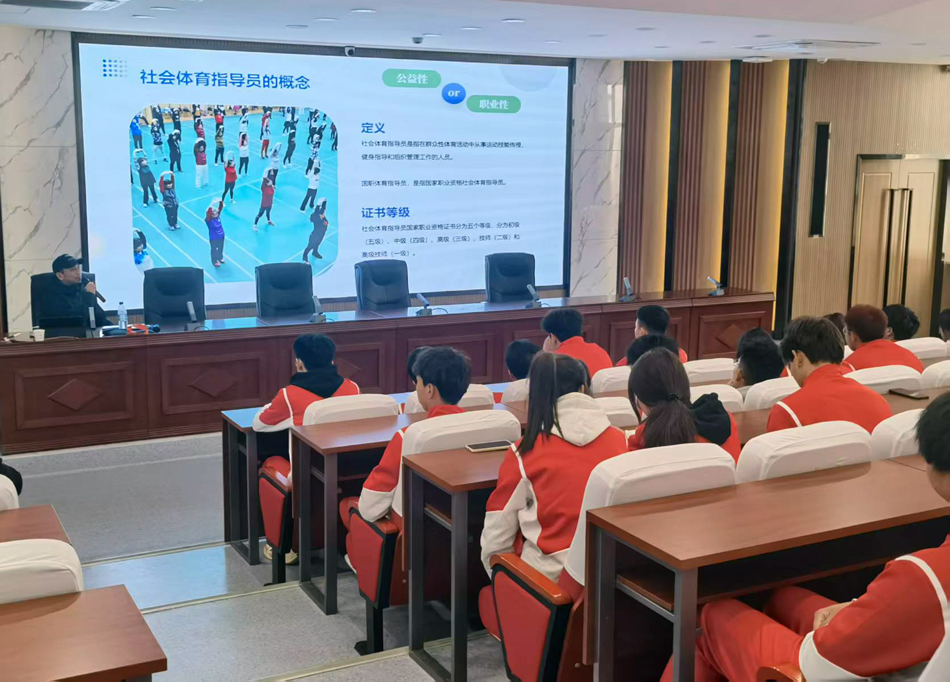应太阳成集团tyc234cc邀请,3月16日,兰州交通大学副教授硕士生导师吕梁在一号报告厅作题为“探索国职之路,点亮体育未来”科普报告会。2024级全体员工参加,大家共同开启了一场关于国家级社会体育指导员职业资格(以下简称“国职”)的求知之旅。
