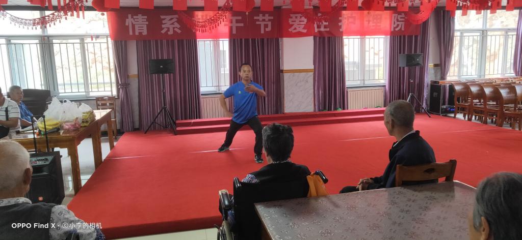 聂晶老师为老人们表演24式太极拳以内外兼修柔和缓慢轻灵刚柔并济的拳术展示表演,并讲解太极拳松沉柔顺、圆活畅通用意不用力的运动特点。