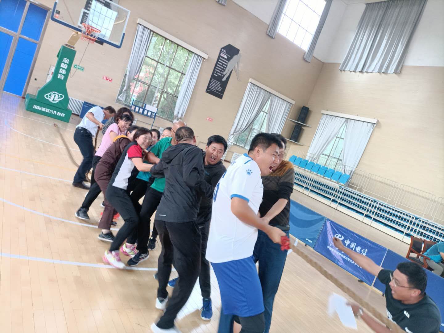 哨声响起,比赛开始,随着“一二,一二”的口号,队员们齐心协力、奋力拼搏,拼命向自己的方向拉绳,激烈角逐着一场场激动人心的比赛,其他教师也自发的组成拉拉队为自己的队员加油助威。一刹那,体育馆中队员们的发力吼叫声和拉拉队加油的呐喊声此起彼伏,比赛精彩纷呈,瞬间点燃了体育馆的氛围。
