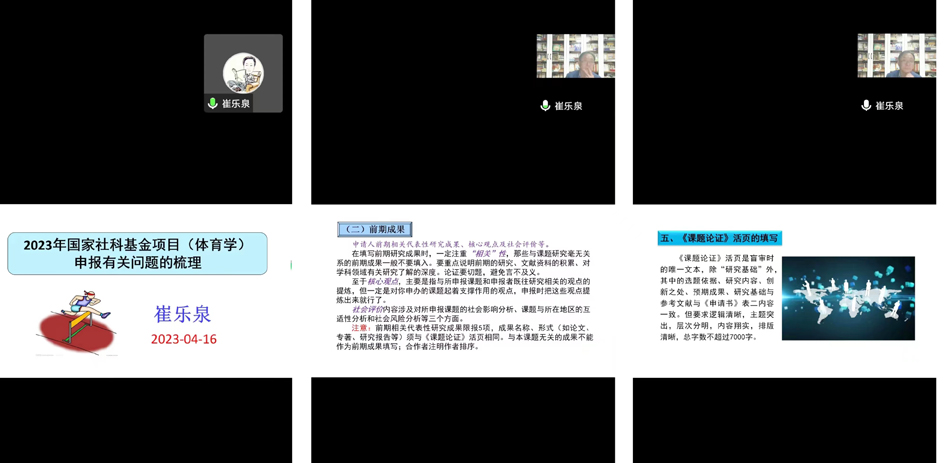 太阳成集团tyc234cc以“三抓三促”行动为抓手,积极组织教师申报高级别科研项目,并及时给予指导辅导。4月19日晚,公司邀请中国体育博物馆研究馆员、郑州大学特聘教授崔乐泉在线为教师作2023年国家社科基金项目申报辅导报告。